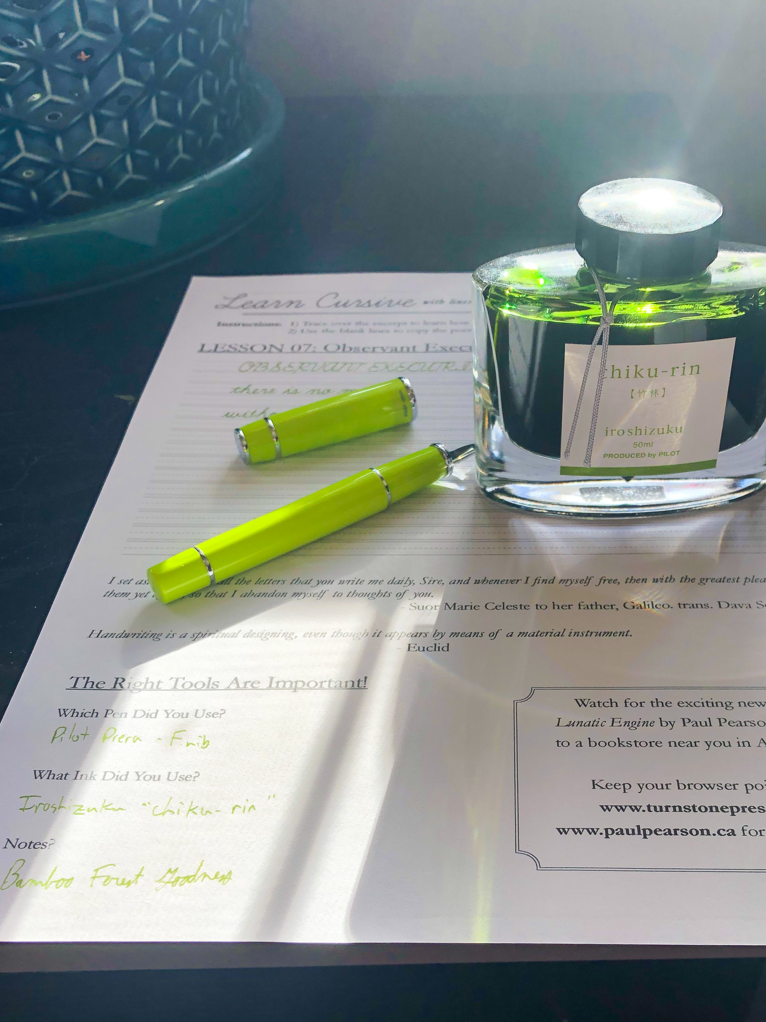 Yes, this is another Pilot Prera paired with another Pilot Iroshizuku ink. Perfectly matched pen and colour. I could write with these until the end of the world and consider it a life well-spent. Look at the way the late afternoon early spring sun comes through.