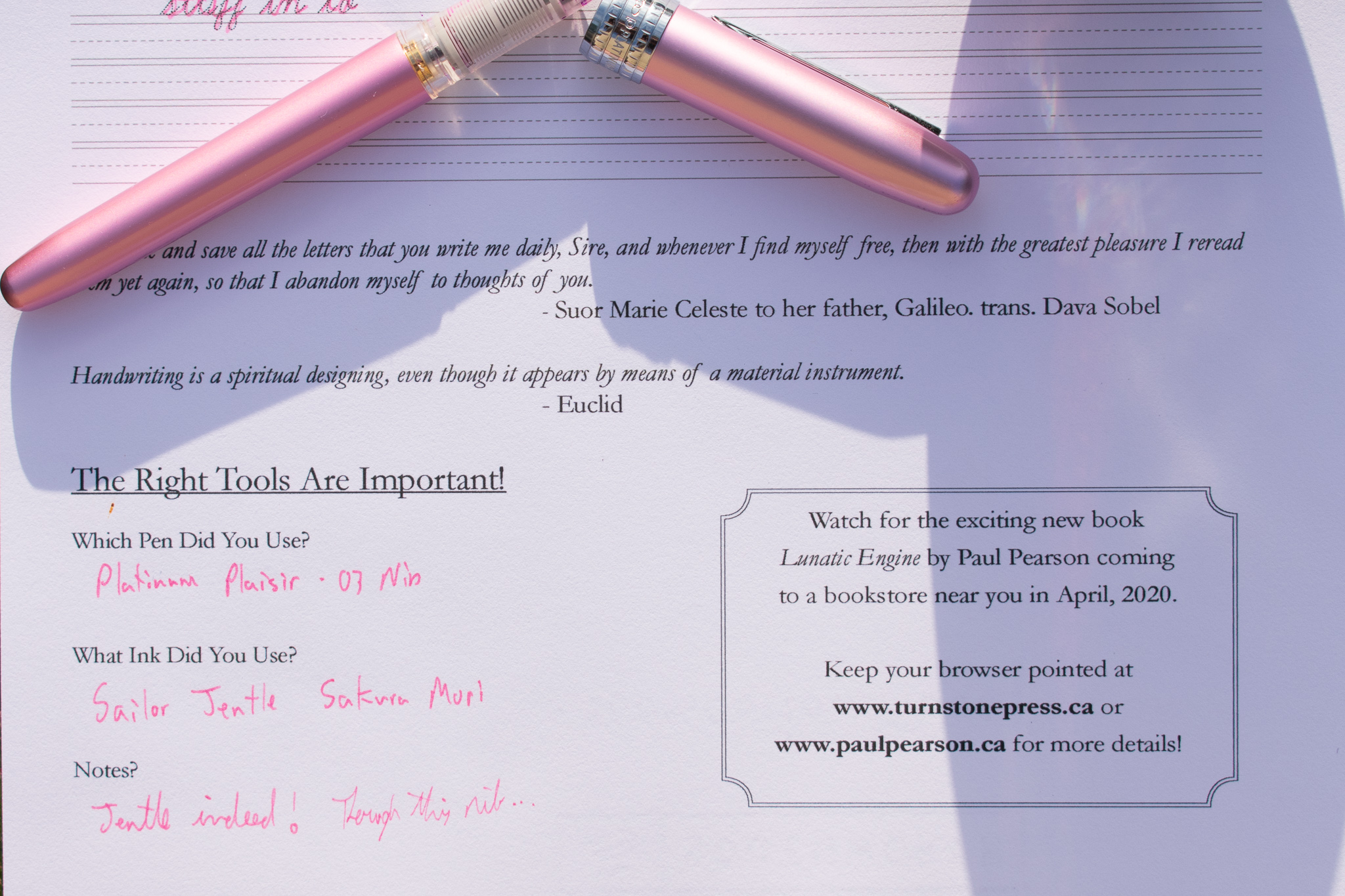 About Learn Cursive with Lunatic Engine. Each week, until my first book of poetry launches in April 2020, I am going to complete a cursive worksheet featuring lines from the poems in the book with notes on which tool I used. I will post the blank sheets as pdf’s below and here on the full explanation page for you to download, print and complete.