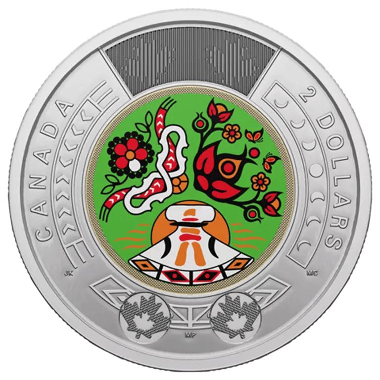 So how does one celebrate NIPD In Canada? Well, the Royal Canadian Mint announced on June 21 that it was releasing a new Two Dollar Coin (toonie) designed by a collaboration of three artists: Megan Currie of the English River First Nation, Myrna Pokiak (Agnaviak) from the Inuvialuit Settlement Region and Jennine Krauchi of the Red River Métis.