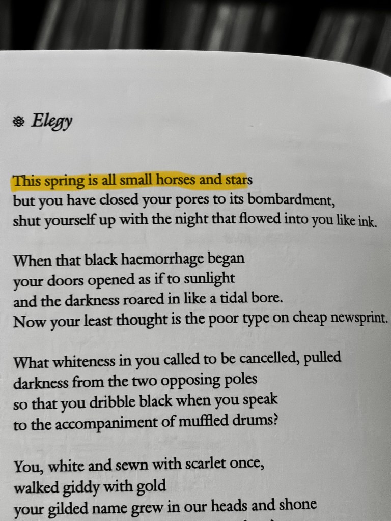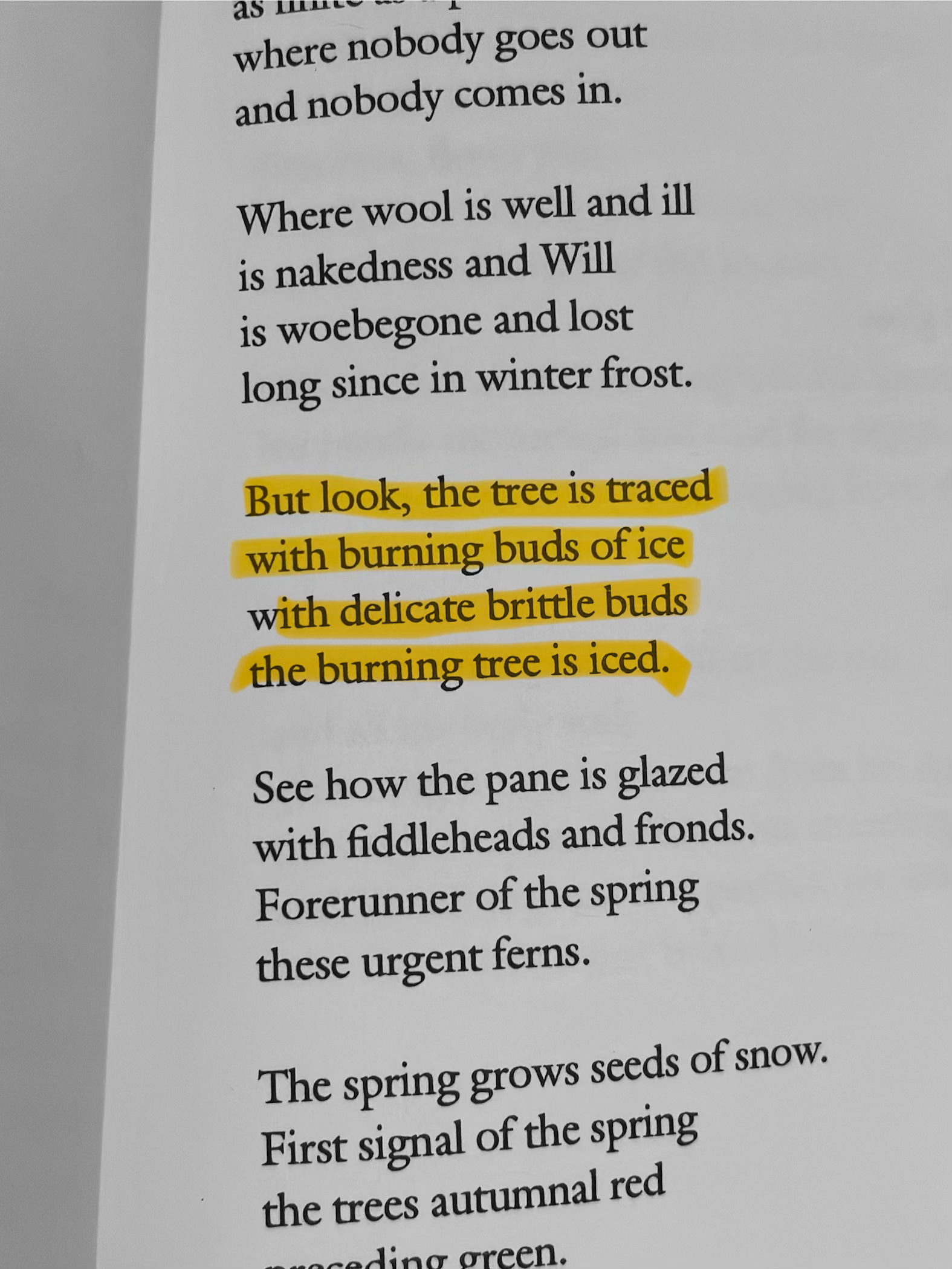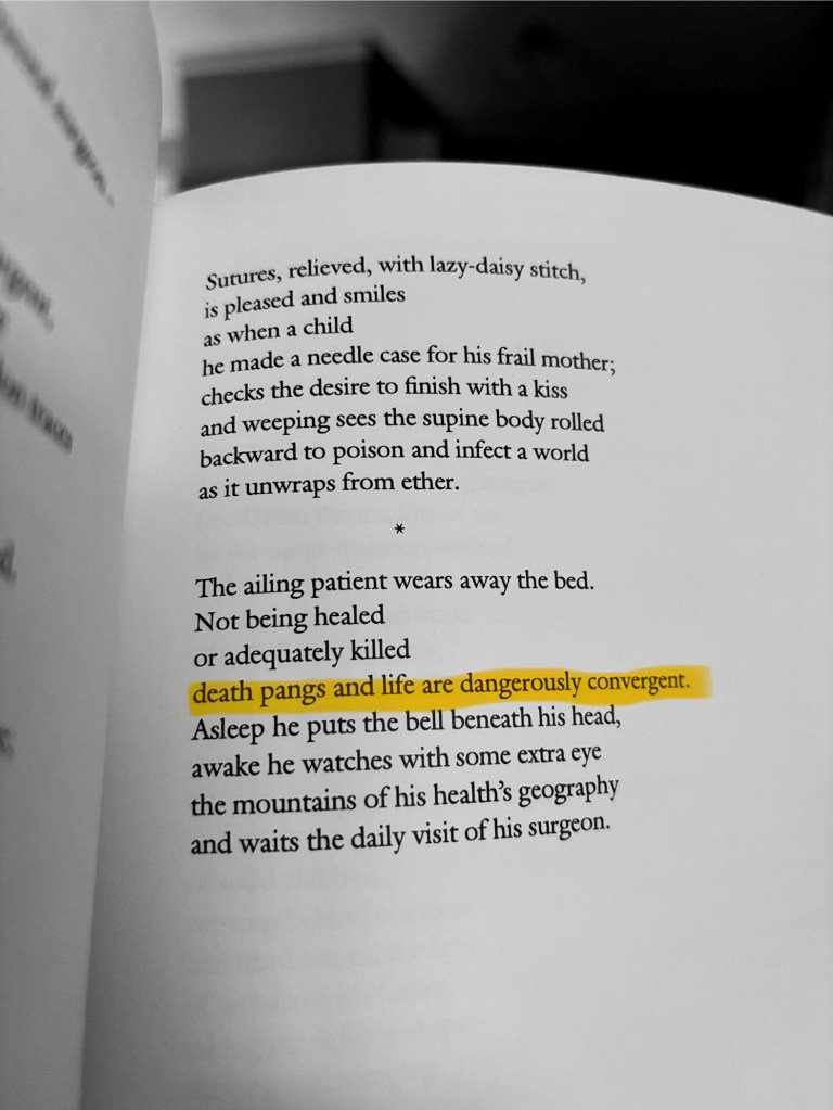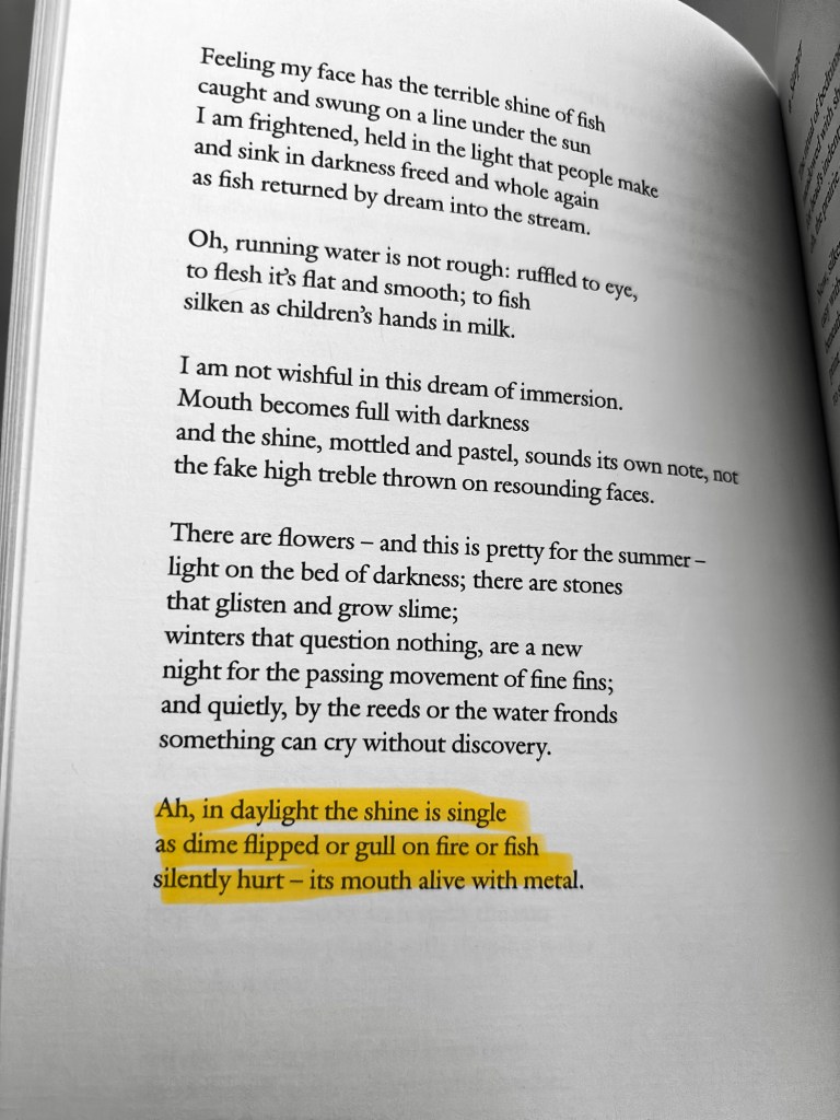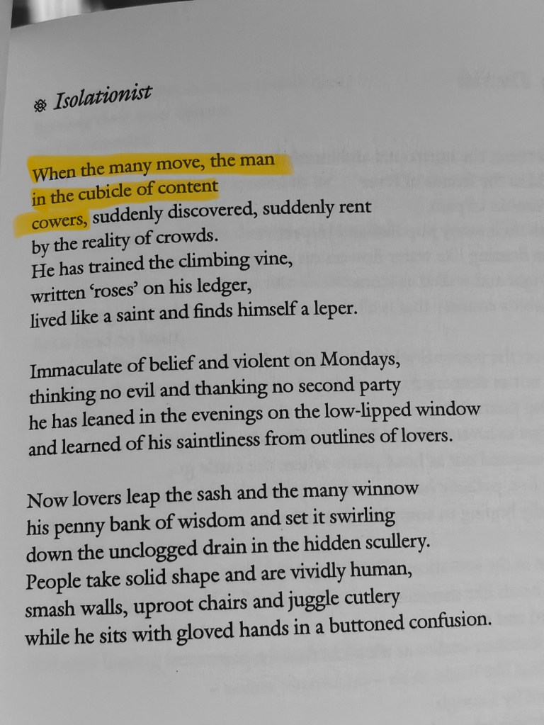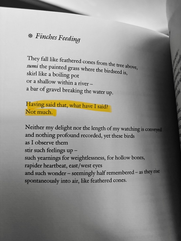 This post is about age, I think. All of the poems I remember loving were still in the book but, to varying degrees, they hit differently. For instance, I have very clear memory from the first time I read ‘Finches Feeding’ of obsessing over the image of birds being “like feathered cones.” This time around, the uncertain middle of the poem struck me more: “Having said that, what Have I said? / Not much.” There were more than one similar instances of this shift. Some lines, however, hit just the same. “The sun has beaten its palms flat against glass” from ‘Bed-Sitting Room” is still as powerful an image as it ever was.