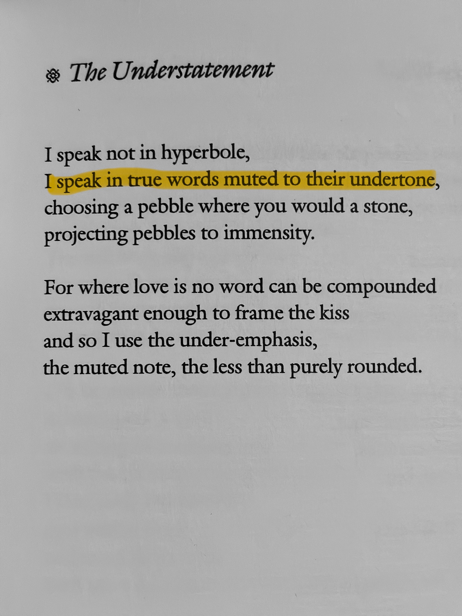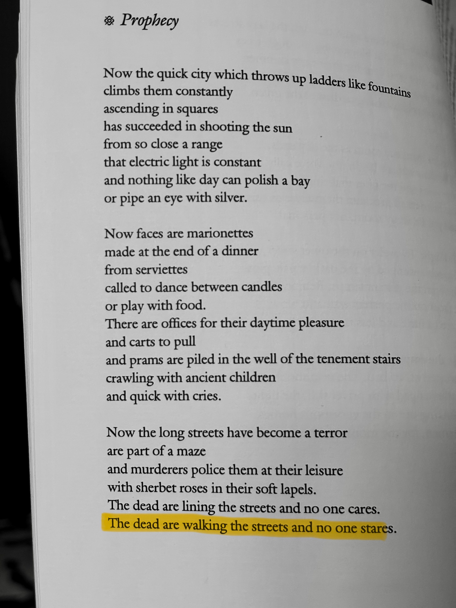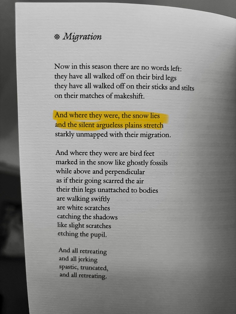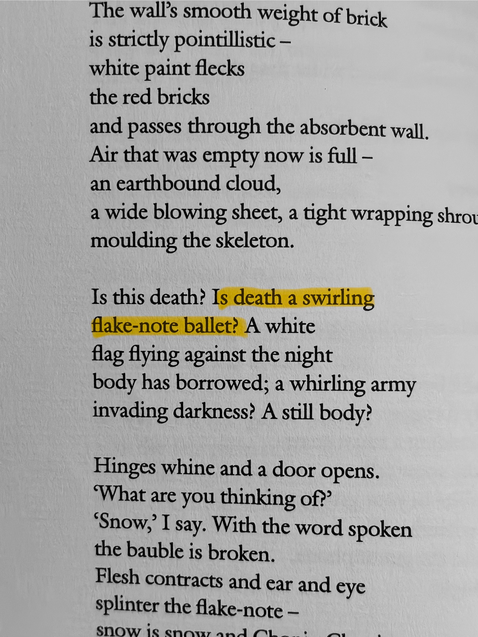This post is about age, I think. All of the poems I remember loving were still in the book but, to varying degrees, they hit differently. For instance, I have very clear memory from the first time I read ‘Finches Feeding’ of obsessing over the image of birds being “like feathered cones.” This time around, the uncertain middle of the poem struck me more: “Having said that, what Have I said? / Not much.” There were more than one similar instances of this shift. Some lines, however, hit just the same. “The sun has beaten its palms flat against glass” from ‘Bed-Sitting Room” is still as powerful an image as it ever was.