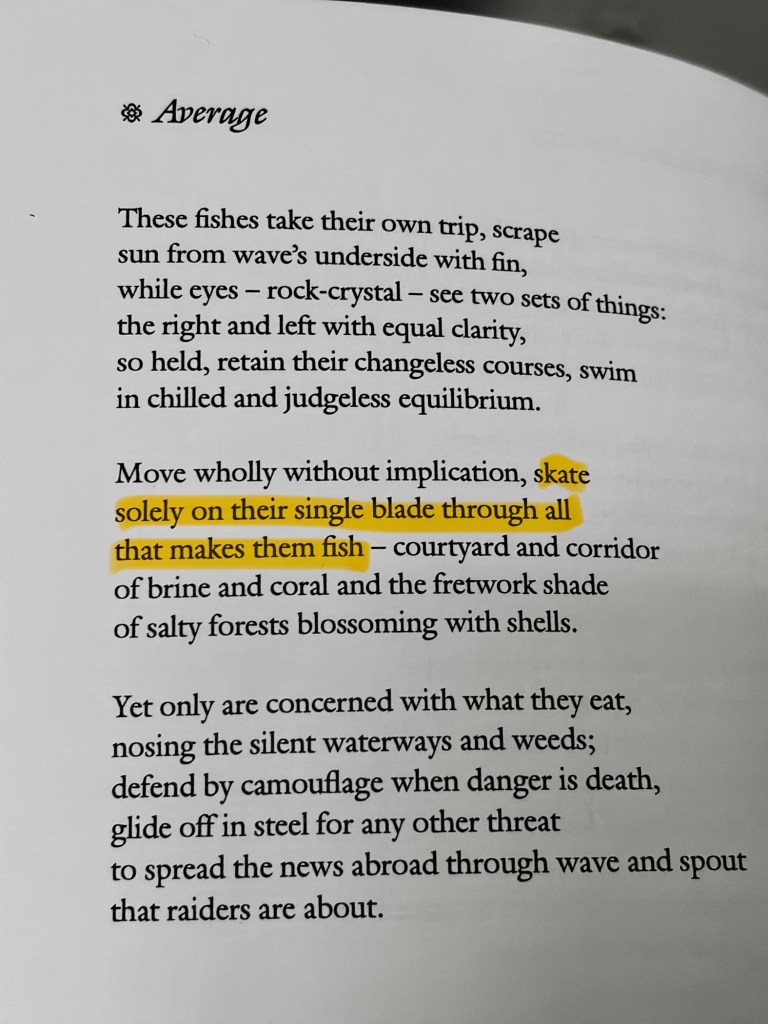 Another feature of this book, and of poetry from the mid-century and earlier, that I hadn’t thought about for years was the non-use of pronouns in certain situations. The most clear example from my two weeks of posts comes from ‘Average’: “These fishes take their own trip, scrape / sun from wave’s underside with fin.’ Not with “their” or “its” fin. Just fin. This is a construction I don’t think I’ve seen in a new poem in ages. Something about ditching the pronoun here opens the image just wide enough for the reader to slip into scale, and later, ride our own single blade. To become fish.